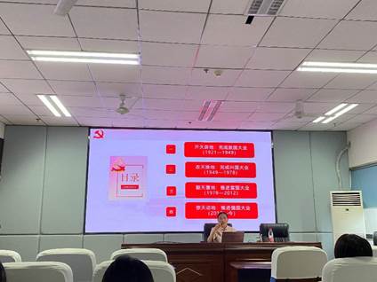 何玉霞老师将我们党的百年发展历程概括为四个阶段,即“开天辟地:完成救国大业(1921-1949)”、“改天换地:完成兴国大业(1949-1978)”、“翻天覆地:推进富国大业(1978-2012)”和“惊天动地:推进强国大业(2012-今)”四个阶段。本次音乐党课围绕这四个阶段讲述了歌曲的创作背景、音乐形式以及历史意义。开天辟地阶段的代表歌曲有《长征组歌》、《黄河大合唱》和《东方红》,这些经典歌曲为我们呈现了一个个激烈抗争的救国故事,让在场的学生党员经历了一场红色洗礼。代表改天换地的经典歌曲有《义勇军进行曲》、《歌唱祖国》和《祝酒歌》等,将新中国成立后社会主义革命和建设的历程展现在我们眼前;《在希望的田野上》、《我和我的祖国》、《春天的故事》和《天路》等经典歌曲又将我们带入了改革开放推进富国大业的翻天覆地的阶段;而《共筑中国梦》、《不忘初心》、《新的天地》和《灯火里的中国》等经典歌曲为我们展现了一幅幅党的十八大以来我们党带领全国各族人民努力奋进实现中国梦的美好画卷。