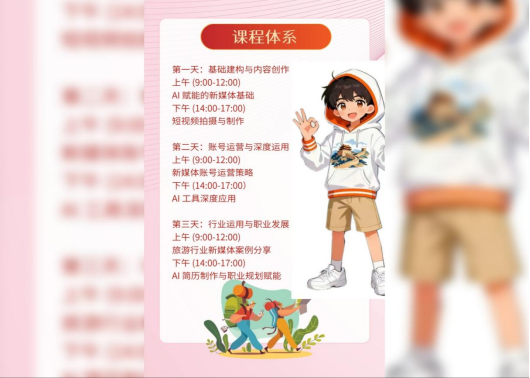 第二天进入 “账号运营与 AI 深度应用” 阶段,进一步提升学生的专业能力。上午课程拆解抖音、小红书、视频号三大平台的运营差异,从内容日历规划、用户社群运营,到旅游账号核心数据(播放量、转化率、互动率)的分析方法,让学生掌握 “精细化运营” 思维;下午则深挖 AI 工具潜力,从 AI 文案优化、旅游场景图像生成,到智能推荐算法的底层逻辑,学生们分组完成 “某景区暑期宣传” 完整内容方案,将 AI 技术融入选题、创作、传播全链条。