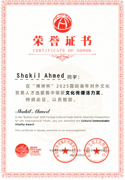 Shakil Ahmed won the Cultural Communication Vitality Award at the “Bozhou Cup” 2025 International Youth Talent Selection Competition for Foreign Cultural Trade. This competition aims to identify outstanding talents with global vision and cultural communication skills. Shakil stood out with his exceptional performance, demonstrating the vitality and potential of our students in the field of cultural exchange.