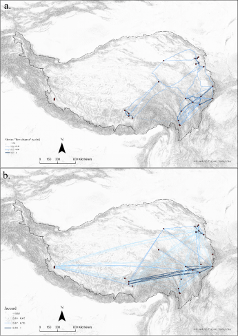 有趣的是,两个网络的对比显示出青藏高原文化互动格局与农牧互动的地理格局具有区域差异。在青藏高原东部,农牧互动的强度与陶器相似程度大体相吻合,显示出该地区物质文化交流确与高原面上的农牧互动路线相关;而在高原西部,农牧互动的强度则远低于陶器相似程度,说明高原内部的农牧互动路线无法充分解释西喜马拉雅地区的文化互动格局。