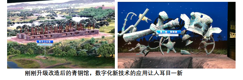 参观完燕家院子后,我们回到三星堆博物馆,大家首先造访了改造升级后刚刚开放的青铜展馆。此次改造最突出的亮点就是运用数字化新技术深入揭示和展现了出土文物的文化内涵,如青关山宫殿以及二号祭祀坑器物分类堆放的动态复原、青铜大立人像的服饰与动作意涵、金杖纹样“鸟・箭・鱼”的来源意象等,以类设题,因题见意,纵向贯通、模拟再现,极大地拓展了观众获取信息的深度,令大家深受启发。