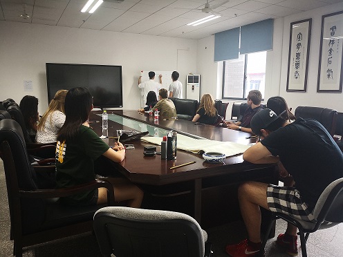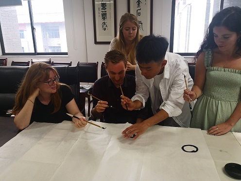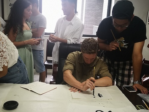 国际交流营的同学们来到江安校区文科楼二区518参加毛笔书法课,亲身实践来体验中国传统书法文化的博大精深。