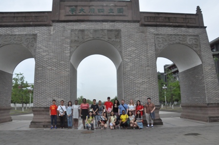 从学院大楼出来,一行人在不远处古色古香的东门下集体合影留念。随后沿着景观水道,经过江安校区图书馆和有名的400米长桥返回出发地,结束了参观活动。