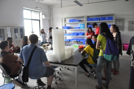 考古博物馆实验室。看到宽敞明亮的实验室里地上,架上摆满了各式各样的出土瓦片、瓷器、石器及仿制的青铜文物,大家都三五成群地细致观察着,实验室负责同学对部分重要文物发掘工作一一作了介绍和说明,并现场回答了外籍学生有关问题。