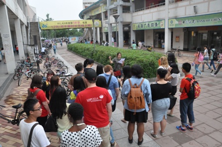 郑慧文同学向交流营外籍学生讲解江安校区历史、建筑和人造景观。走过白石桥,眼见不高山。岷江的支流江安河从脚下缓缓流过,与不远处波光粼粼的明远湖共同构成了江安校区以水为核心的生态环境,集环境生态化、景观园林化、校园信息化一体的新型大学校园的美丽风光令留学生朋友赞不绝口。