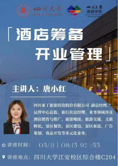 旅游管理专业02级校友、四川亚丁旅游投资股份有限公司副总经理、运营中心总监、旅行社总经理唐小红女士受邀回到母校,为2023级同学们带来“酒店筹备开业管理”专题讲座,本次讲座由巴卡漫画