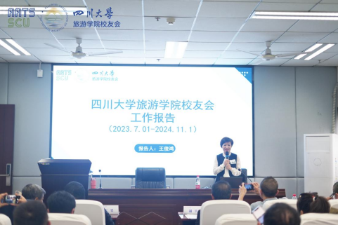 校友会秘书长王俊鸿老师代表旅游学院校友会做2023-2024年度工作报告。王老师介绍了校友会自去年成立以来开展的一系列工作。校友会不断完善组织架构,将学院、行业以及校友的力量紧密结合在一起;积极组织各类活动,增强了校友联系,为在校同学们提供了宝贵的学习和交流机会;加强媒体宣传,及时发布校友活动信息,提高了校友会的知名度和影响力。并对校友会下一阶段的工作计划进行了汇报,她表示,校友会将继续拓宽校友活动空间、丰富校友活动形式、促进校友企业互动,进而实现校友和学院的双向赋能。校友会也将积极寻求自我造血的方式,为未来的长远发展奠定坚实基础。报告全面展示了校友会在过去一年中的工作内容与主要成绩,赢得了在场来宾的阵阵掌声。