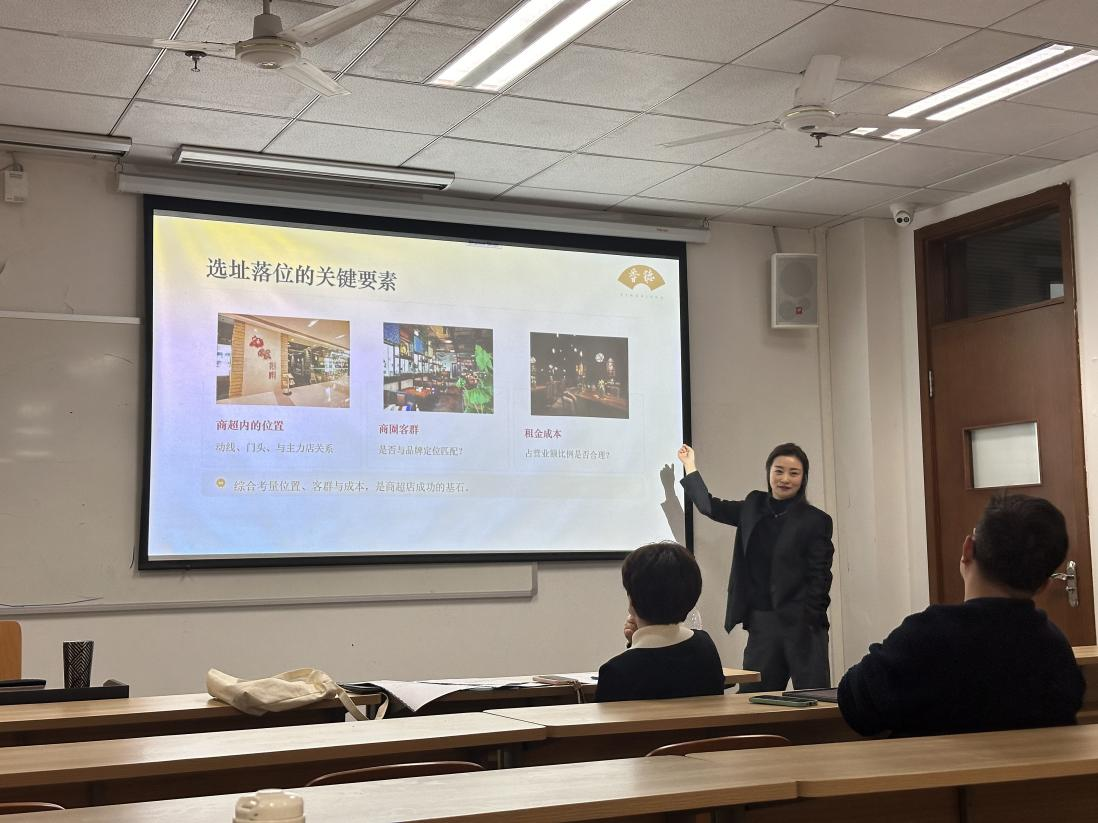 谈及企业的转型与突破,庞静菁董事长分享了多个关键节点的实战抉择:2012 年响应政策导向主动调整产品定价,同时创立 “花醉” 品牌探索商超布局,以4元麻婆豆腐的爆品策略成功打开市场。在从万象城到恒大广场的拓展中,“花醉”品牌根据购物中心与城市综合体的客群差异灵活调整产品定位。此外,静菁董事长还剖析了西宁店拓展失利的案例,指出核心问题在于商超落位与品牌定位不匹配,让同学们深刻理解选址与定位匹配对餐饮企业发展的关键作用。