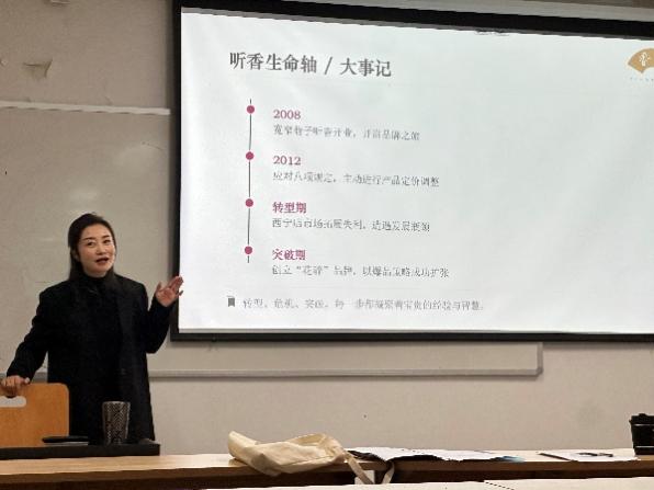 2025年12月28日晚,成都听香餐饮有限公司董事长、成都餐饮同业公会女企业家分会轮值会长庞静菁女士受邀开展专题讲座,以“餐饮企业的战略选择和运营韧性”为主题,分享了听香餐饮17年创业实践中的战略智慧与运营经验。本次讲座由王俊鸿副教授主持,为同学们呈现了一场兼具理论深度与实践价值的行业分享。