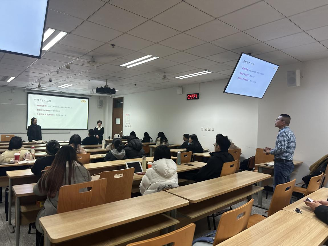互动交流环节,同学们围绕菜品标准化、高端客群维护、节假日运营应对、行业竞争突围等问题踊跃提问。庞静菁董事长结合实战经验逐一回应,分享了“核心岗位稳定+不定期抽查”的川菜标准化路径、“店长牵头+细化服务”的客群维护方法,以及在行业内卷中“坚守自身特色、持续创新融合”的破局之道。她鼓励同学们,创业需兼具战略眼光与务实精神,既要敢于突破常规,也要重视精细化管理与风险控制。